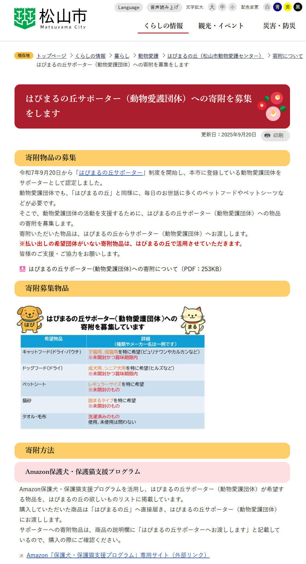 はぴまるの丘サポーター(動物愛護団体)への寄附を募集をします